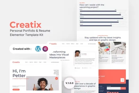 Creatix– é um Elementor Template Kit completo criado especialmente para a criação de um site pessoal para mostrar seus trabalhos. Este template possui um design moderno, clean e exclusivo com layout 100% responsivo e fácil de personalizar.